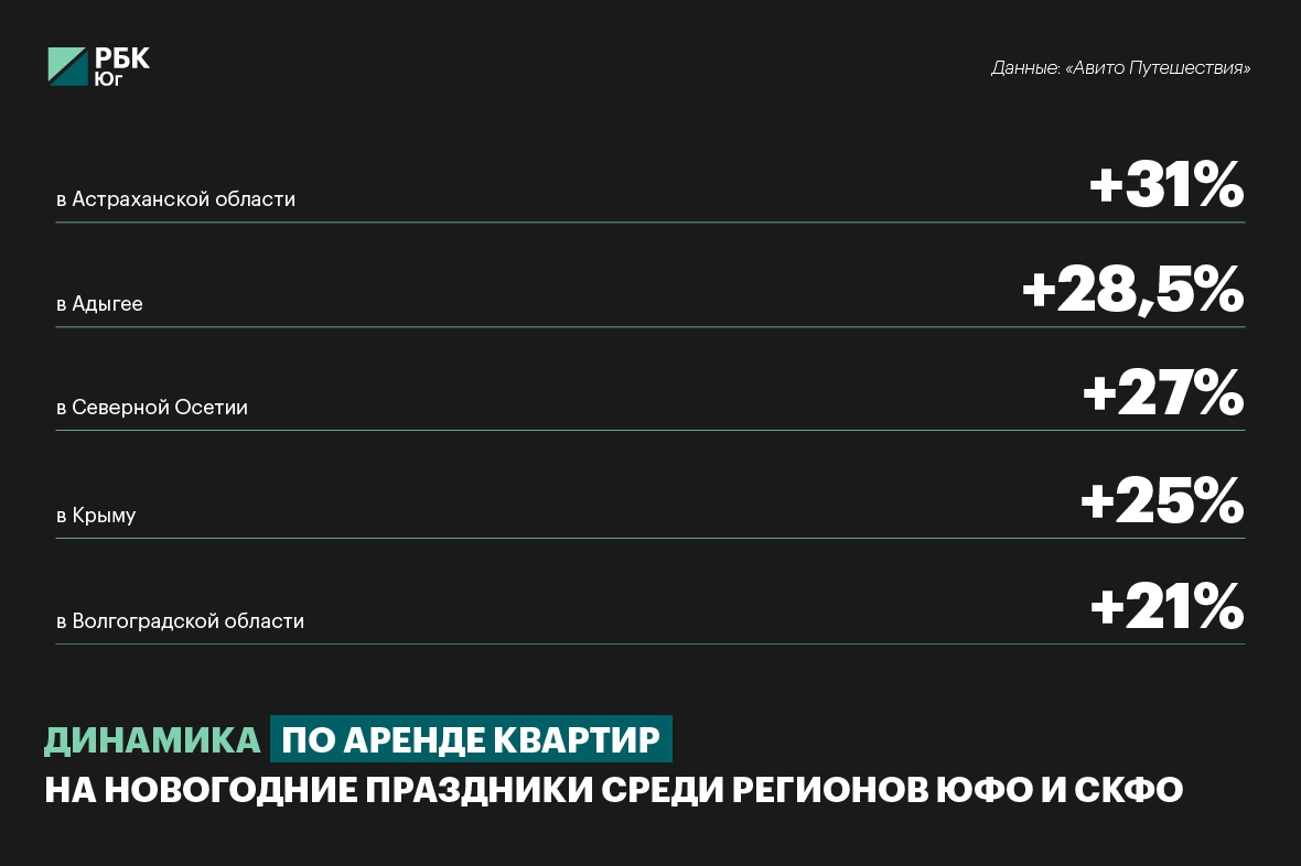 По данным платформы «Авито Путешествия», в Южном федеральном округе на новогодние праздники (31 декабря 2025 — 10 января 2026) пользователи забронировали на 30% больше посуточных квартир и на 75% больше загородных домов, чем в прошлом году. При этом в Северо-Кавказском федеральном округе спрос на квартиры вырос на 90%, на загородные дома — на 91% относительно прошлого года.