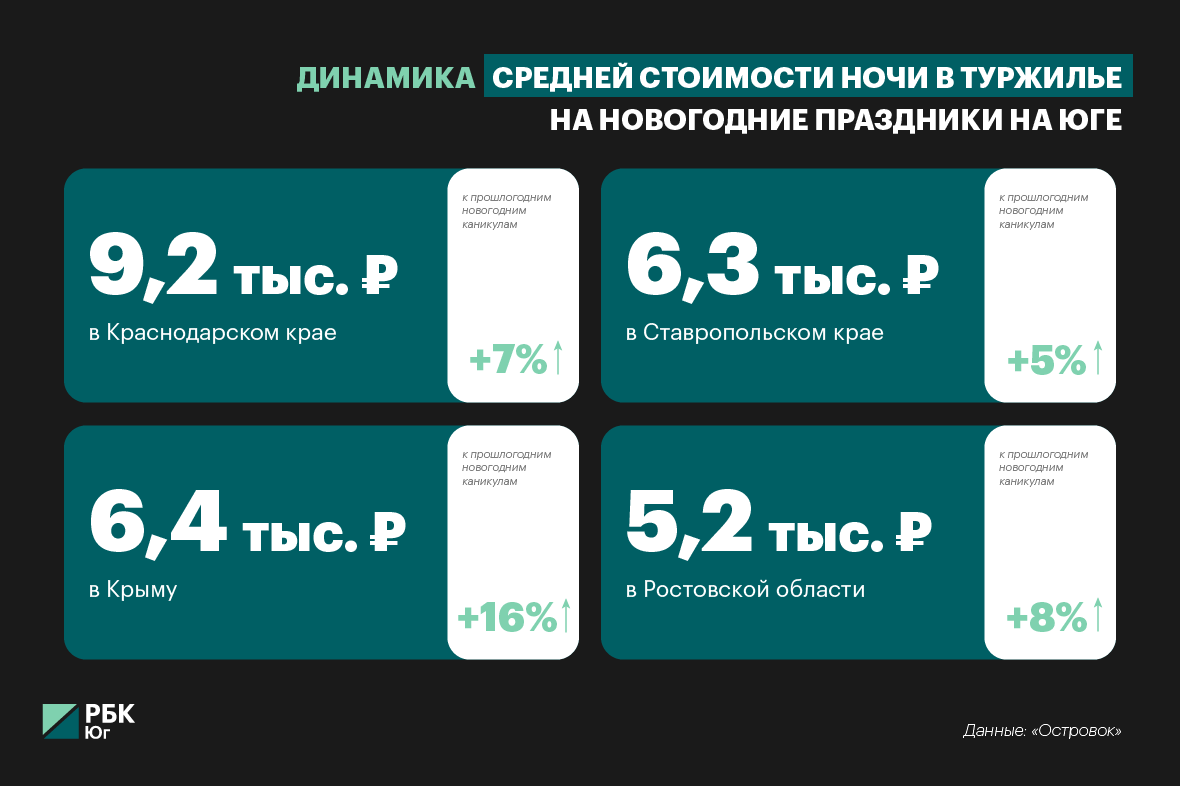 В «Островке» сообщили, что динамика средней стоимости ночи на новогодние праздники в Краснодарском крае составила 9,2 тыс. руб. (+7%, 8,6 тыс. руб.), в Ростовской области — 5,2 тыс. руб. (+8%, 4,8 тыс. руб.), в Ставропольском крае — 6,3 тыс. руб. (+5%, 6 тыс. руб.), в Крыму — 6,4 тыс. руб. (+16%, 5,5 тыс. руб.). Средняя стоимость ночи в отелях и апартаментах Сочи на новогодние праздники составила 6,7 тыс. руб. (без изменений в сравнении с прошлым годом).