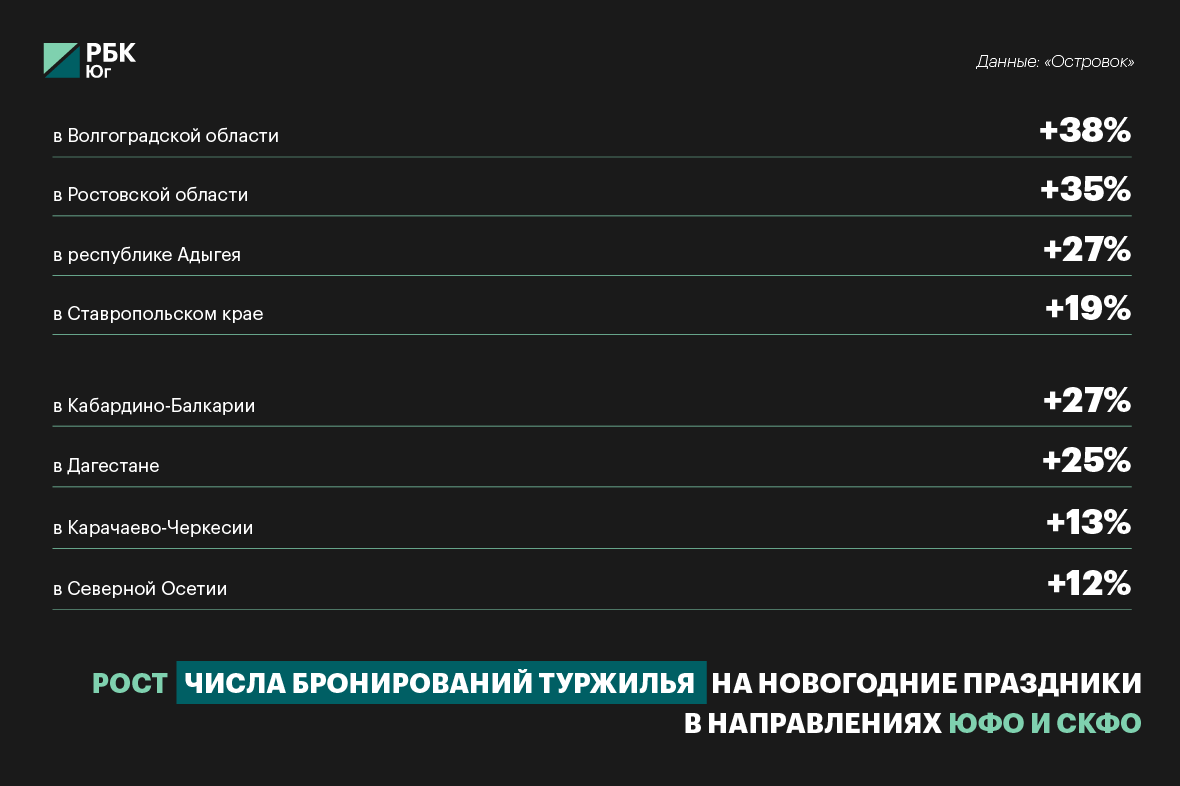 По версии «Островка», среди направлений ЮФО по итогам праздников отмечается рост числа бронирований в Волгоградской области (+38%), в Ростовской области (+35%), а также в республике Адыгея (+27%) и Ставропольском крае (+19%). Среди регионов Северного Кавказа наибольший прирост бронирований зафиксировали в Кабардино-Балкарии (+27%), Дагестане (+25%), Карачаево-Черкесии (+13%) и Северной Осетии (+12%).