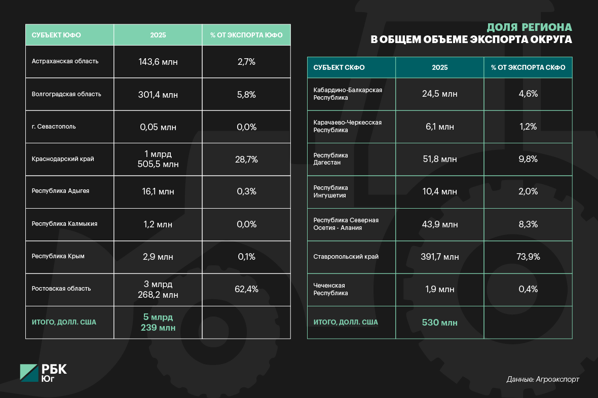 — Регионы Юга и Северного Кавказа — это крупные производители зерновых, растительных масел, мясной и молочной продукции. При этом они обладают выгодным логистическим расположением — рядом с портами Азово-Черноморского и Каспийского бассейнов. Неудивительно, что АПК этих регионов, особенно Ростовской области, Краснодарского и Ставропольского краев, в значительной степени ориентирован на экспорт.